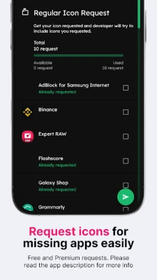 Don't worry; we offer a full refund within the first 7 (seven!) days of purchase. No questions asked! But, if you're willing to wait a little longer, we update our app every week, so many more apps, including those you've missed, will be covered in the future. We also offer Premium icon requests if you want to skip a line. With the Premium request, you will get your requested icons in the next update (or two) for our pack.
